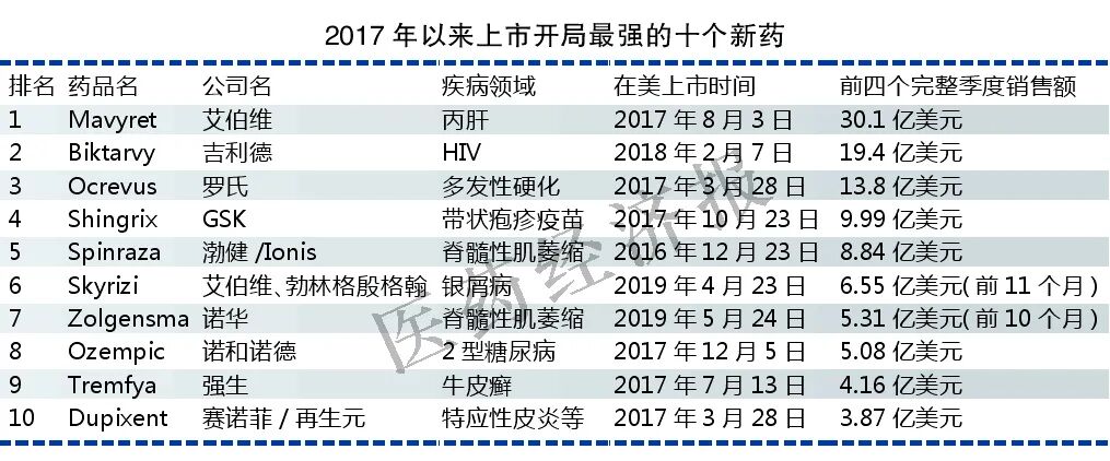 FiercePharma根据获批上市后前4个完整季度的销售额高低,汇总出2017年以来上市后开局最强的十大“最猛”新药。