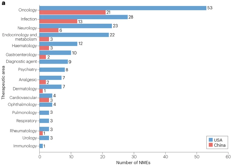 在此期间,针对癌症和传染病的药物是在中美两国都批准的NME中最常见的。值得注意的是,2015–2020年间,FDA批准的53种针对肿瘤适应症的NME中有21种(40%)在中国获得批准,而相应在2004–2014年间,58种NME中有14种(24%)获得批准。这一比例的提高可能是由于NMPA引入了适应症团队审查系统,该系统成立于2016年,始于肿瘤学适应症。中国癌症患者的大量未满足需求也加快了中国进口肿瘤药物的审批。
