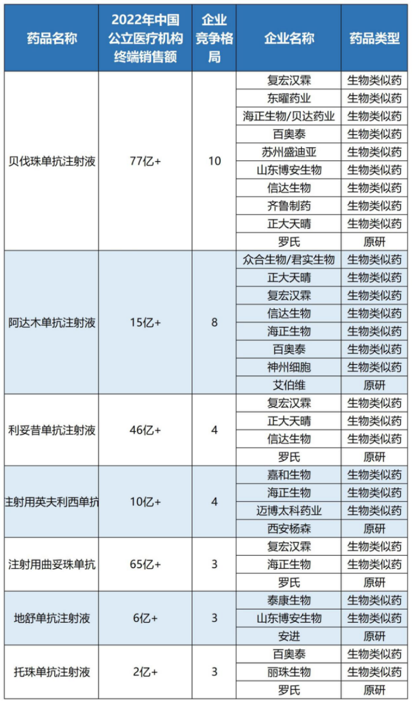 随着生物药市场竞争日渐火热,生物药纳入集采亦是大势所趋。据不完全统计,国内生物药及生物类似药获批企业≥3家的品种有7个,包括贝伐珠单抗注射液、注射用曲妥珠单抗、利妥昔单抗注射液、阿达木单抗注射液、注射用英夫利西单抗、地舒单抗注射液以及托珠单抗注射液。数据显示,上述品种2022年在中国城市公立医院、县级公立医院、城市社区中心以及乡镇卫生院(简称中国公立医疗机构)终端销售规模分别超过77、65、46、15、10、6及2亿元。