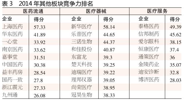 截至2015年6月5日,在符合评选条件的上市医药公司中,以医药流通、医疗器械和医疗服务为主营业务的企业分别有17家、23家和8家。2010~2014年主营业务收入CAGR分别为21.9%、26.1%和29.9%,净利润CAGR分别为21.1%、17.6%和26.4%,主营业务收入占医药板块比重分别为40.7%、3.1%和1.8%,医药流通板块收入集中度极高,净利润占比分别为14.1%、5.3%和2.6%(三板块竞争力排名见表3)。