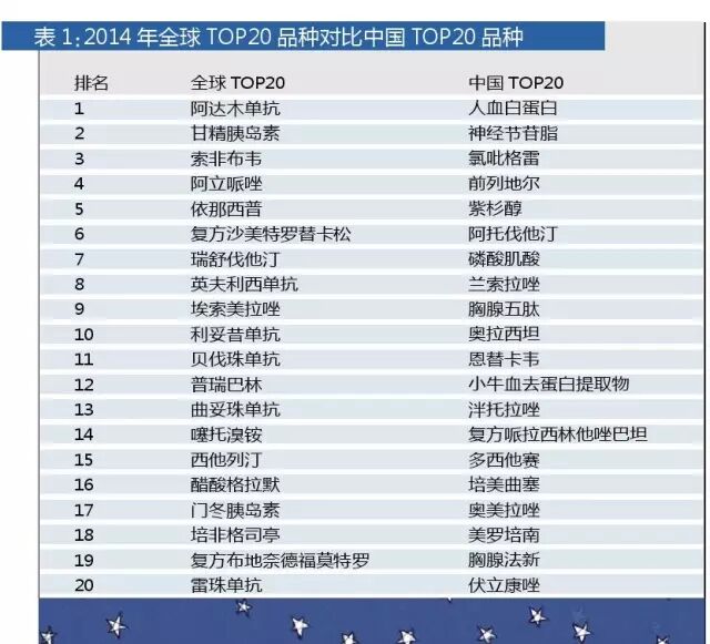 为了进一步确定数据的准确性,笔者重建了TOP 20模型,全球最畅销的TOP 20数据来源于IMS的公开数据,而中国最畅销的TOP 20数据来源于药学会数据,两个数据均以产品名进行分析排序,对不同商品名的同一产品名药物数据进行了汇总,并且排除了氯化钠注射液和葡萄糖注射液等基础用药。对比两组畅销药排名数据,全球TOP 20品种均未进入中国的TOP 20。