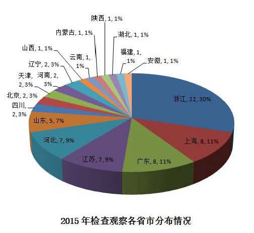 2015年国外监管机构GMP检查的观察任务渉及浙江、上海等18个省市,其中浙江、上海、 广东、江苏、河北、山东占全部任务量的17%。浙江22个观察任务占据30%全国最高。