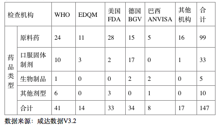 国际药品GMP检查观察中涉及到的药品包括原料药、口服固体制剂、生物制剂、吸入剂、医药中间体、诊断试剂、膳食补充剂等147个产品。在147个检查的产品中,包括99个原料药的检查,33个口服固体制剂的检查,5个生物制剂的检查。