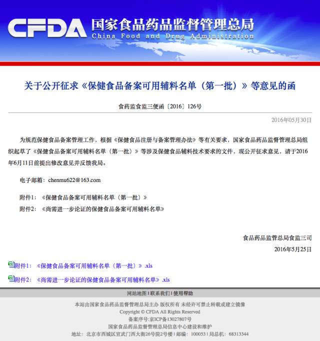 5月30日, CFDA官网挂出<保健食品备案可用辅料名单(第一批)>征求意见, 本次公开征求意见的第一批名单共有155个辅料,尚需进一步论证的保健食品可用辅料名单137个。