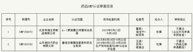 根据国家食品药品监督管理总局<药品生产质量管理规范认证管理办法>和<关于印发药品生产质量管理规范认证管理办法的通知>(国食药监安 [2011]365 号)的规定,经现场检查和审核,北京祥瑞生物制品有限公司因补充申请未获批准、山东新时代药业有限公司因药品注册申请撤回,本次认证申请不通过,现予公示。公示期为 10 个工作日,自 2016 年 6 月 20 日至 2016 年 7 月 1 日。