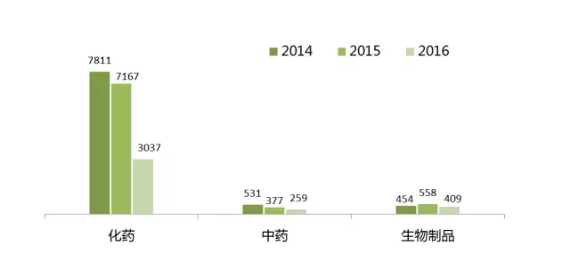 2016年CDE共承办药品注册申请3781条(按受理号计,下同),其中化学药品3037条、中药259条、生物制品409条,相比2015年分别下降58%、31%和27%。化药申报数量腰斩。