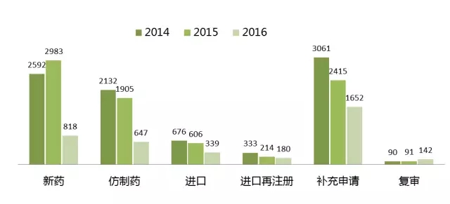 从申报类型上看,除复审数量有所提升外,其他类型申报的数量均大幅缩水。新药、仿制药相比2015年分别减少72.6%、66.0%。