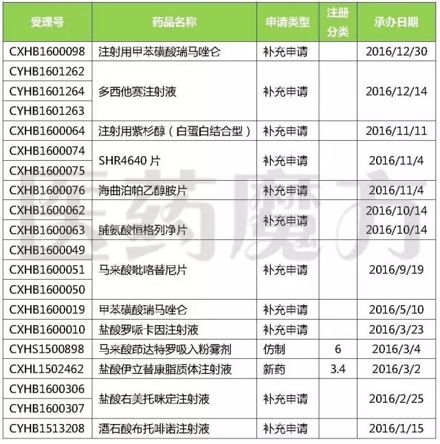 2016年,江苏恒瑞医药股份有限公司的申报乏善可陈,仅有1个6类仿制药(马来酸茚达特罗吸入粉雾剂)和1个3.4类新药申请,其余均为补充申请,而且还撤回了两个重磅品种磷酸瑞格列汀和聚乙二醇重组人粒细胞集落刺激因子注射液(19K)的生产申报。