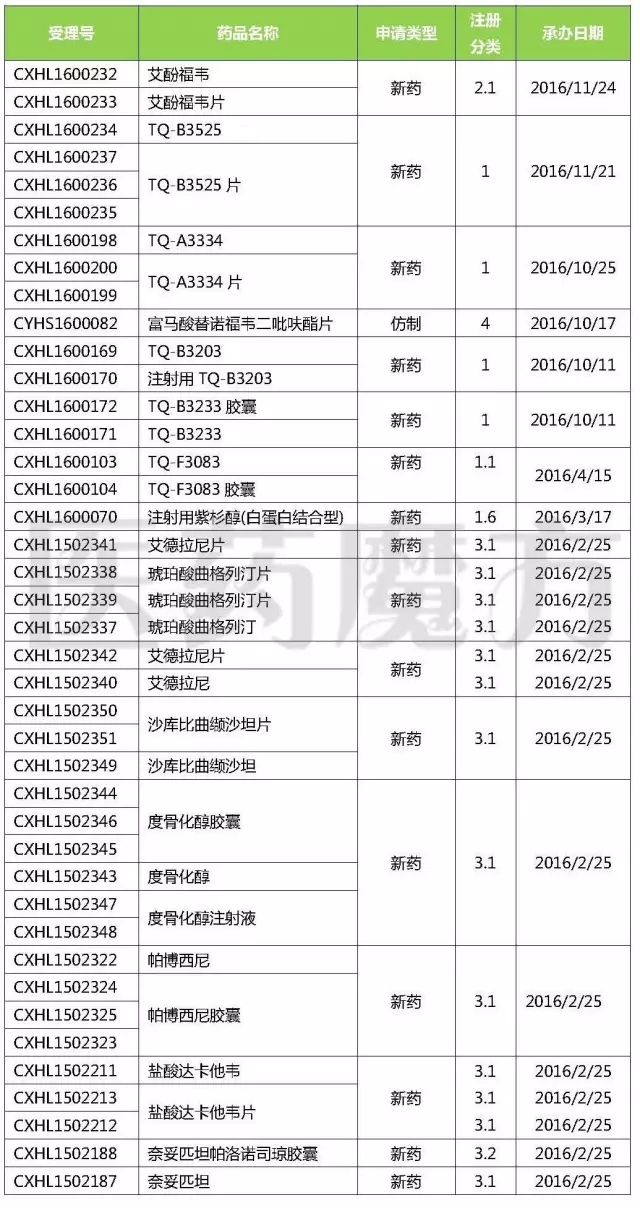 正大天晴在2016年的表现堪称土豪,共申报了14个(以受理号计)1类新药,新药管线迅速膨胀。此外还包括2个2.1改良型新药、23个3.1类新药,1个3.2类新药。唯一的仿制药替诺福韦二吡呋酯已进入申请生产阶段,并被纳入优先审评。