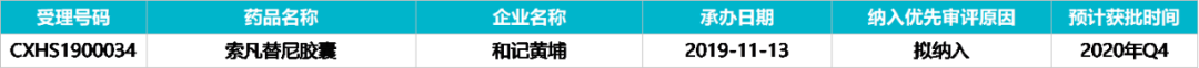 该药于 2019 年 10 月 29 日获得 CDE 承办,2019 年 12 月 5 日拟纳入优先审评程序。目前处于新报任务在审,预计 2020 年 Q4 获批